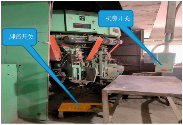 包装操作工踩下踏板,水泥包装机开始工作;包装操作工脚离开踏板,包装机停止工作。
