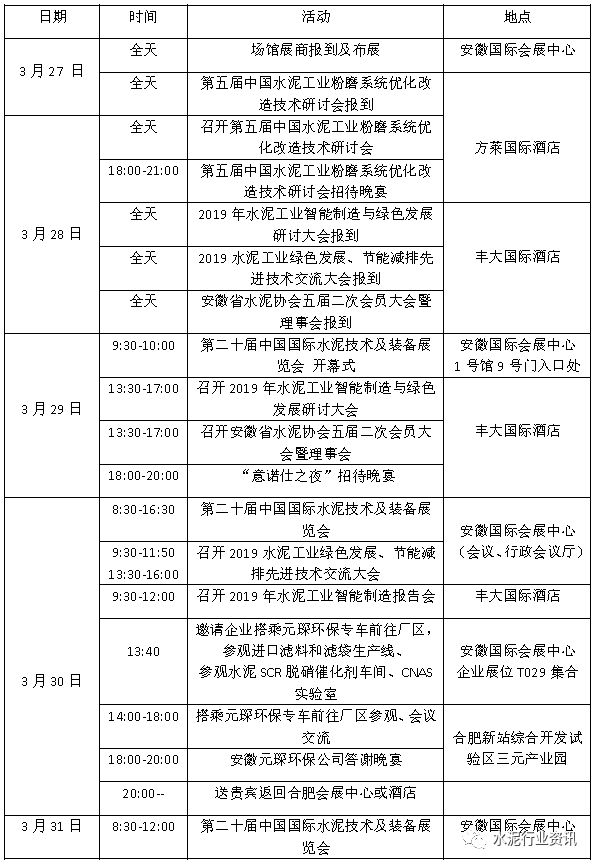 3月29-31日,一年一度的世界水泥装备大会—第二十届中国国际水泥技术及装备展览会(Cementtech2019)将在合肥·安徽国际会展中心盛大开幕。本届展会展示面积达12000平方米,汇聚来自全球的160余家展商现场展示水泥行业新产品与新技术。