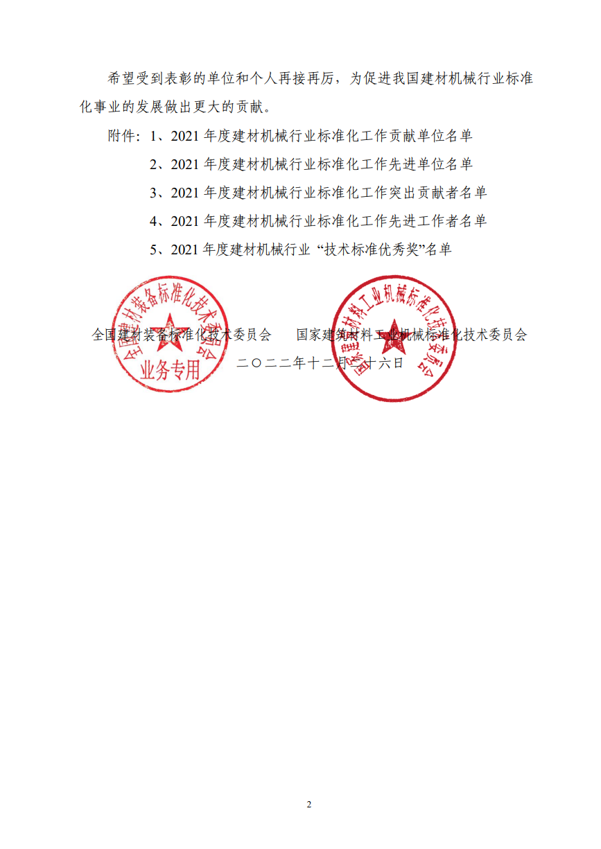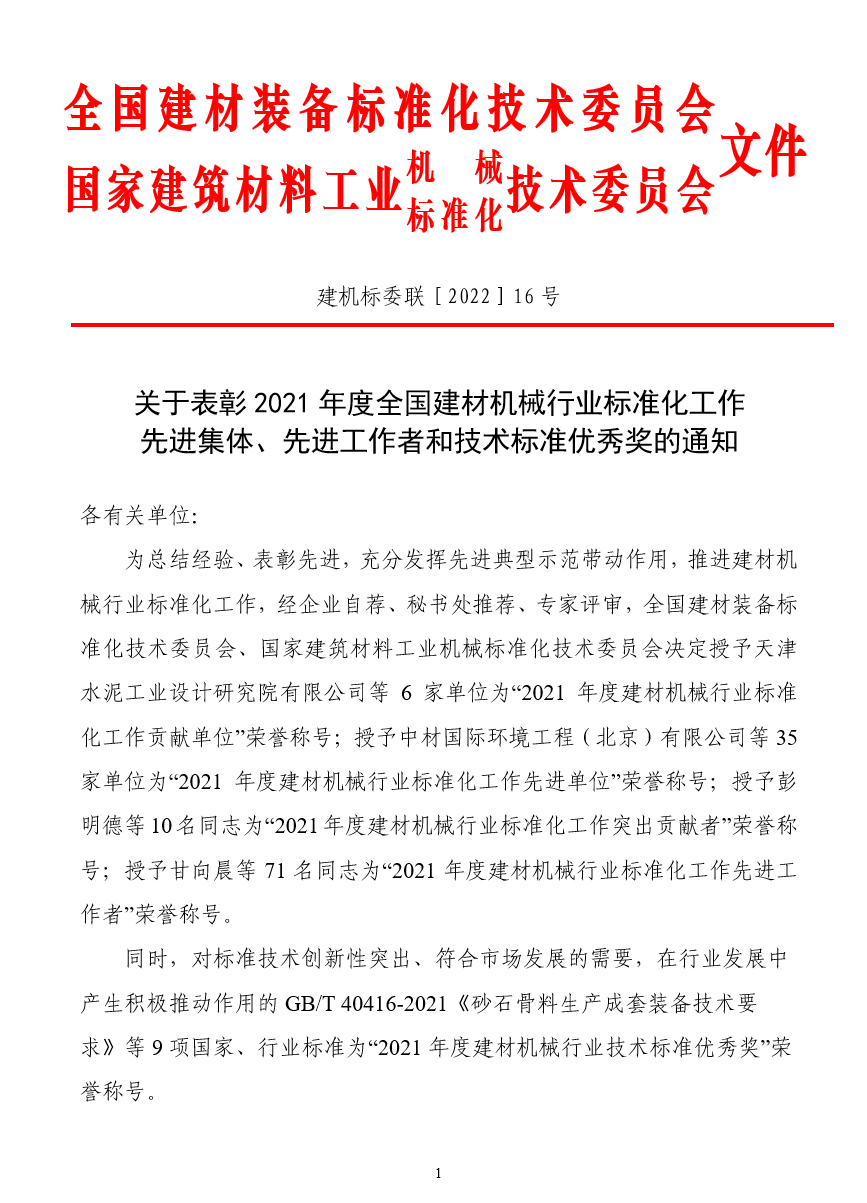 2021年度建材机械行业"技术标准优秀奖"名单